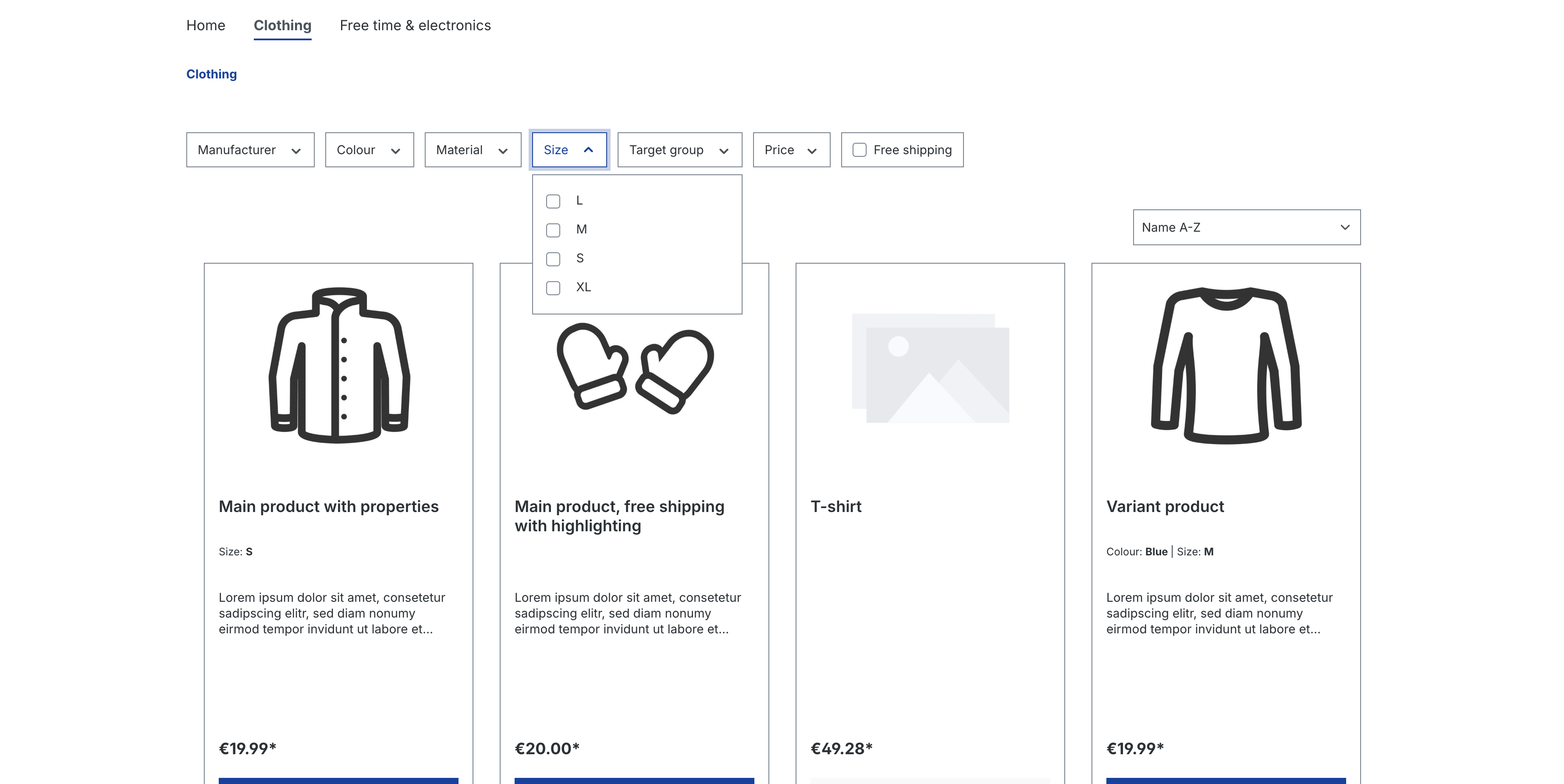 Product properties are attributes that describe products, such as material, color, brand, length, etc. These properties allow you to filter products in category lists and search results. For example: