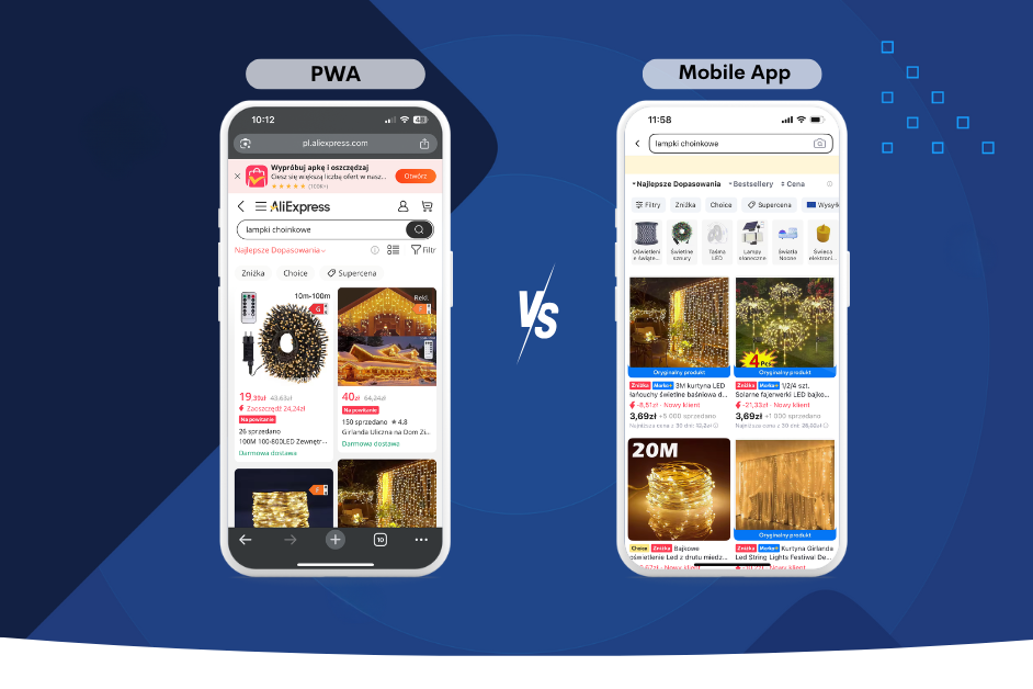 AliExpress is a perfect example of a multi-channel strategy. The eCommerce giant offers fully developed native apps for both Android and iOS, available in Google Play and App Store. In parallel, the platform implemented PWA, which significantly improved conversion rates and mobile performance. Users can choose what they want to use – the classic app from the store or the web version that works like an app.