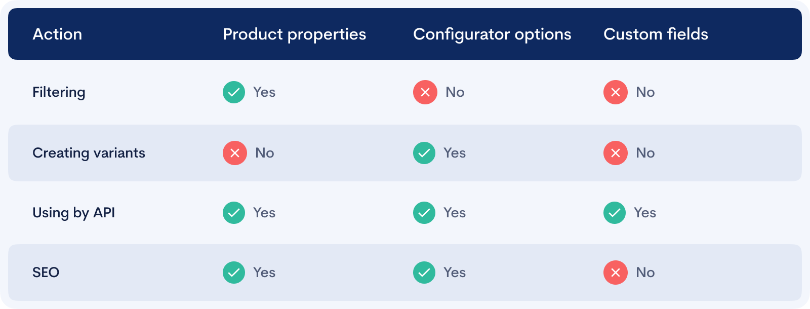Product properties are a powerful tool that can significantly improve the performance of your store, but only if they well-thought-out, consistent, and properly implemented. Whether you are building a small clothing store or a large electronics platform, it is worth taking the time to design a good properties structure.